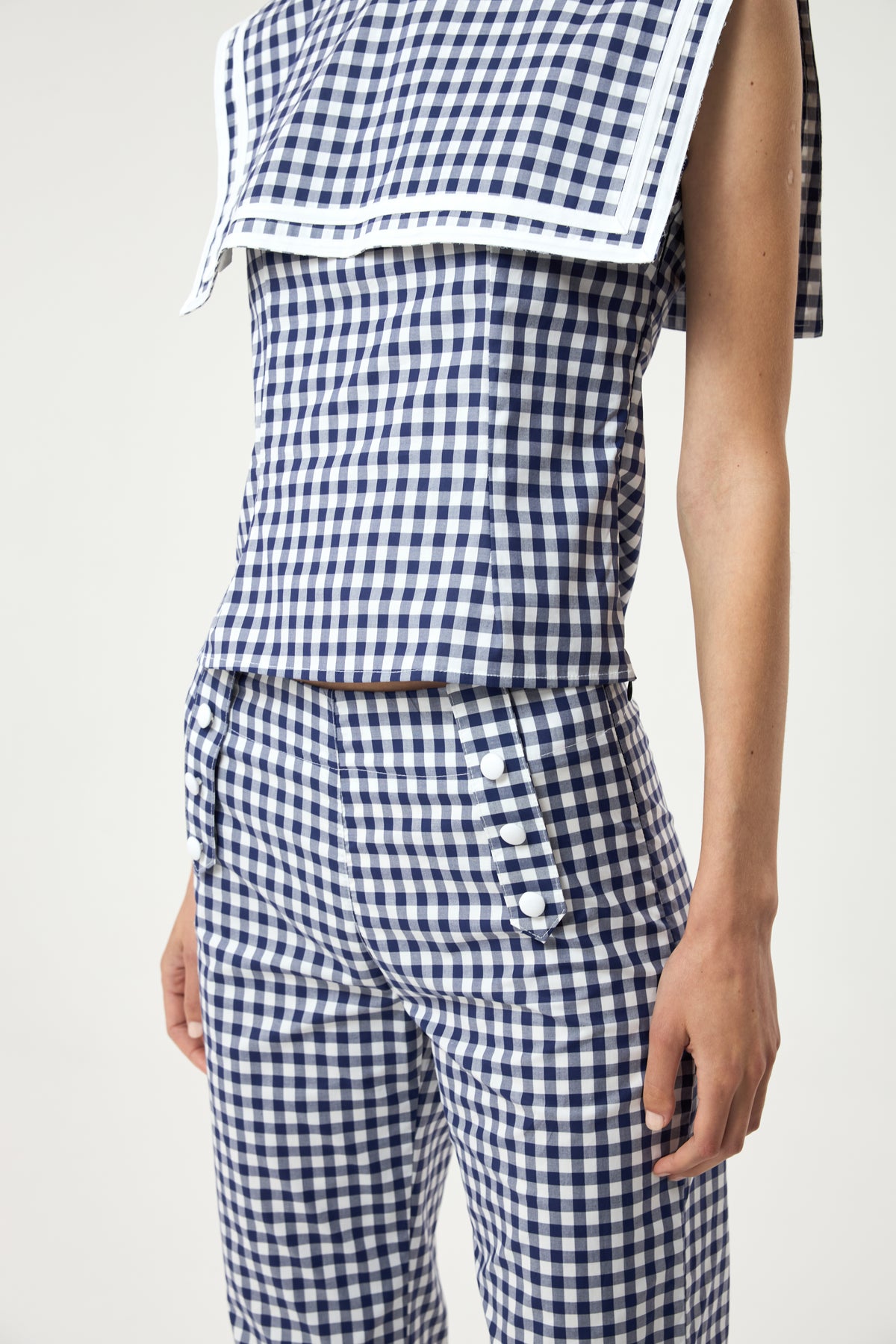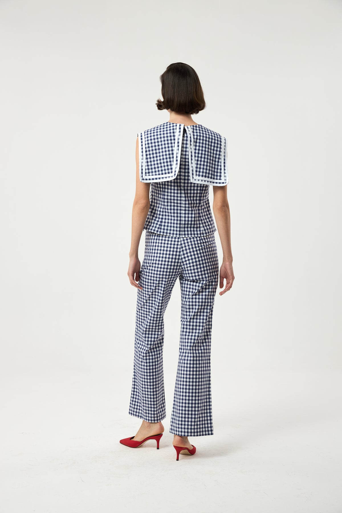 A nod to 60s French summer style. This sleeveless top features a structured fit and a statement sailor collar. Available in three charming colors — navy gingham, airy blue gingham, and ecru linen — it can be worn alone or paired with the matching Aline trousers for a coordinated look.